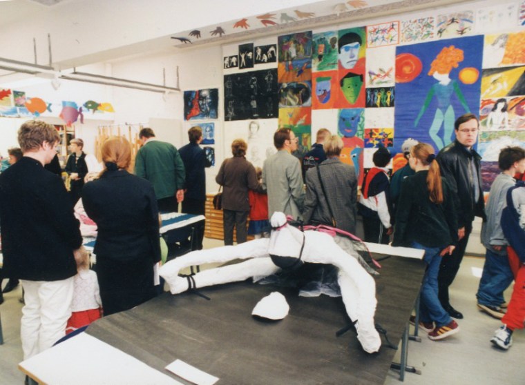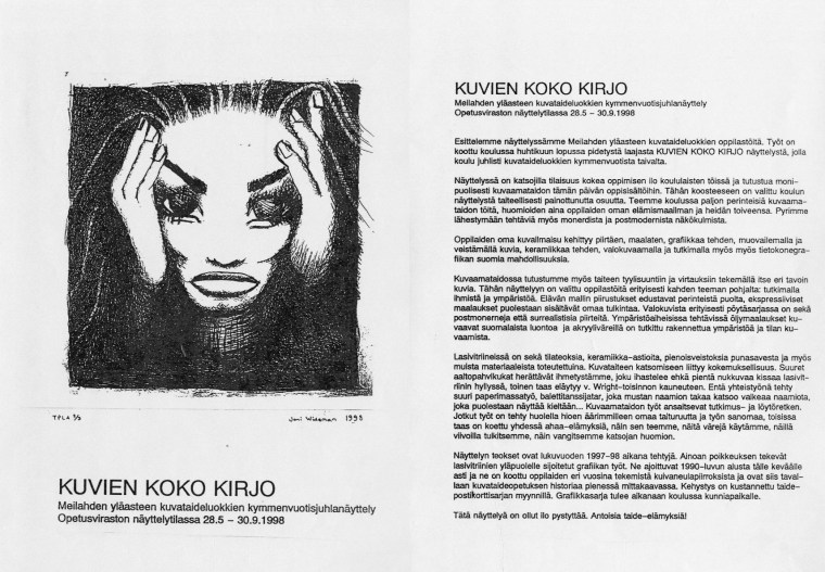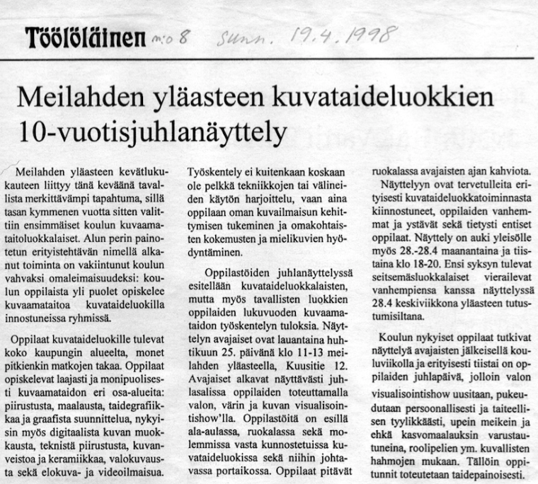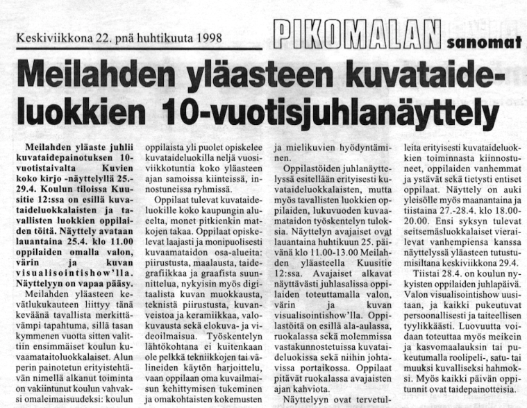 Meilahden yläaste juhli kuvataidepainotuksen 10-vuotistaivalta Kuvien kirjo -näyttelyllä 25.-29.4.1998.